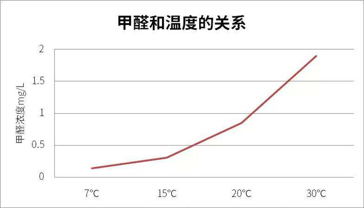 中南大學能源科學與工程學院對“人造板材甲醛釋放參數及溫度的影響”的研究表明:溫度升高會促進板材內甲醛釋放,溫度每升高5℃,甲醛釋放量會增加10%~30%。西安交大參與的《板式家俱甲醛釋放與環境溫度定量關系研究》通過對照試驗得出數據:冬季室內空氣的甲醛超標率為20%,春季室內空氣的甲醛超標率為36%,夏季室內空氣的甲醛超標率為84%,秋季室內空氣的甲醛超標率為70%。室內甲醛釋放與環境溫度成正比。很明顯,由于溫度和濕度增高,夏季環境中室內家具釋放甲醛速度更快,濃度更高。即便考慮到冬天北方室內開通的暖氣,一年中也是夏季室內甲醛濃度更高。