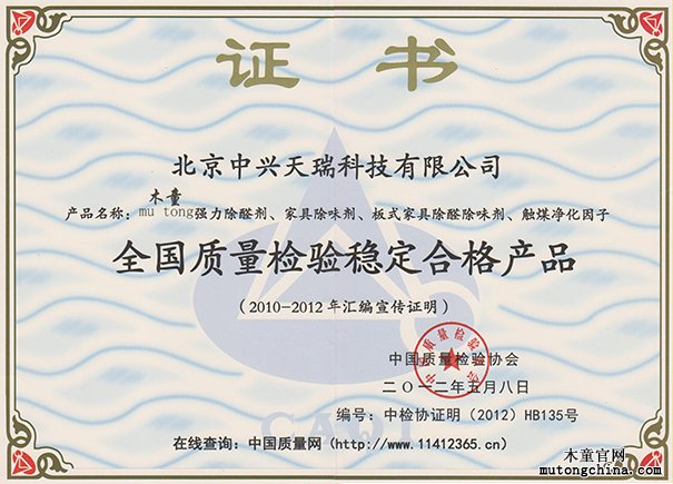 北京中興天瑞旗下木童除甲醛產品市級獨家經銷商證書
